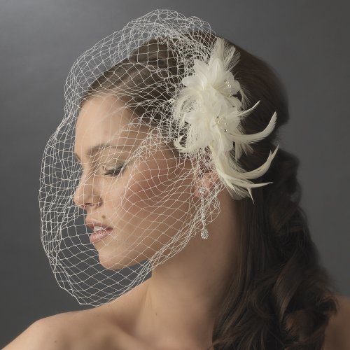 A chic alternative to a long veil, this stunning birdcage veil fastens to your hair with a 3" comb. The comb ornament is a charming double cloth flower with faux pearl, rhinestone, and seed bead accents. Feathers spray from the 5" ornament, and the veil measures 11" long and 12" wide. IVORY color